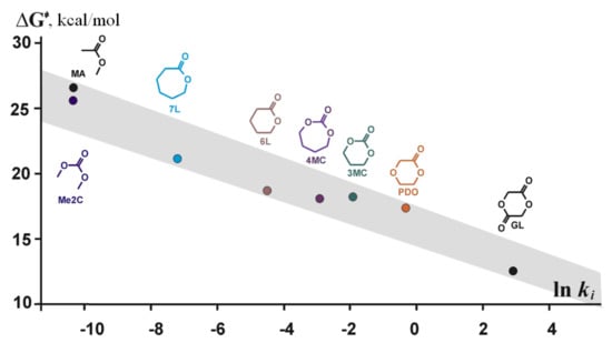 ΔG≠ – ln ki correlation in TBD-catalyzed ROP/transesterification. The colored version of the figure presented in []. Copyright (2015) Springer Nature.