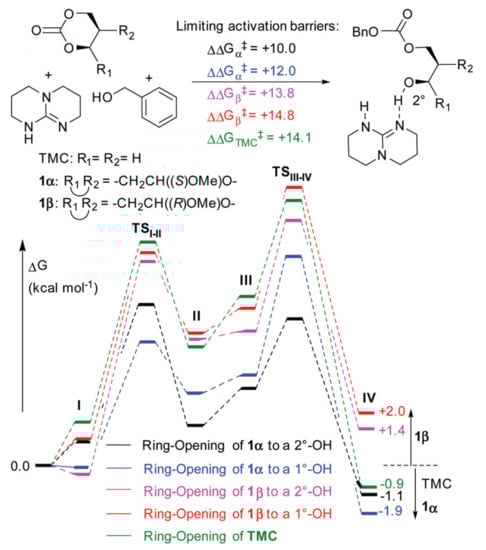 DFT modeling of the initiation step in the ROP of 1α, 1β, and TMC with TBD catalyst and BnOH initiator involving formation of ternary complex I, nucleophilic addition of BnOH (TSI–II) to form quaternary intermediate II, TBD migration III for ring-opening (TSIII–IV) to expose a primary (1°–OH) or secondary alcohol (2°–OH) in IV. Reprinted from []. Copyright (2017) Royal Society of Chemistry.