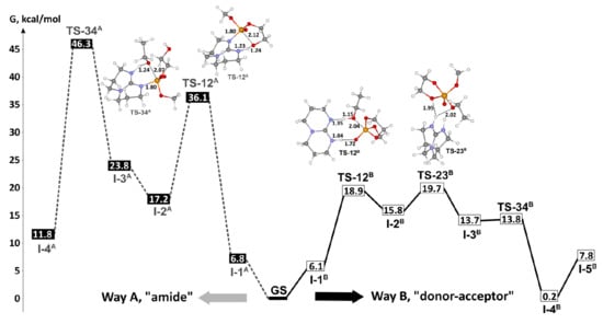 P–O bond cleavage is reaction direction that corresponds to catalytic ROP of ethylene phosphates (Scheme 3b). Very recently, we made DFT modeling of TBD-catalyzed polymerization and transesterification of MeOEP [,] at the B3PW91/DGTZVP level of theory [,]. We performed DFT modeling of TBD-catalyzed reaction of MeOEP with EtOH for both alternative mechanisms while taking into account that the amide mechanism (Scheme 4a) was proposed for TBD-catalyzed polymerization of ROEP [,,] (Scheme 4). The comparison of the reaction profiles of “amide” (Figure 25, left) and “donor-acceptor” (Scheme 4b, Figure 25, right) pathways demonstrated that the “donor-acceptor” mechanism was highly favorable by the difference in activation barriers about 26 kcal/mol.
