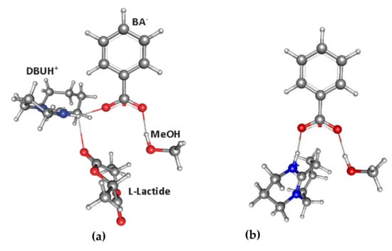 Energy profiles (electronic energies) and structures obtained by DFT modeling of guanidine-catalyzed methanolysis of l-LA for (a) amide mechanism and (b) hydrogen-bonded mechanism. Reprinted with permission from []. Copyright (2008) American Chemical Society.