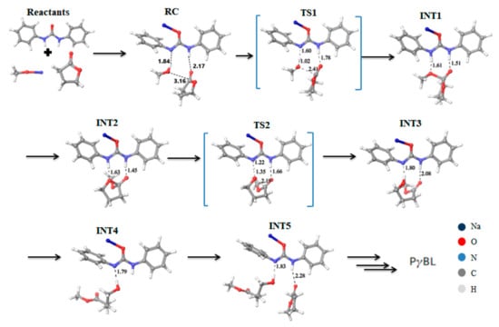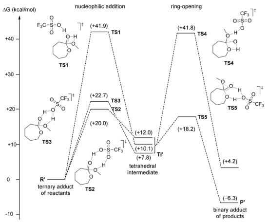 Energy profile and structures obtained for the reaction between δVL and MeOH. Reprinted with permission from []. Copyright (2007) American Chemical Society.