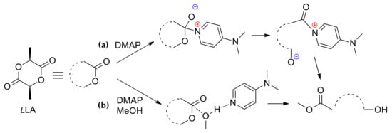 Schematic representation of the nucleophilic/monomer (a) and basic/alcohol (b) mechanisms for (Dimethylamino)pyridine (DMAP)-catalyzed methanolysis of l-LA.