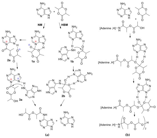 Zinck et al. found some similarities with DMAP-catalyzed ROP of cyclic esters in the polymerization of l-LA catalyzed by adenine without additional initiators []. The formation of adenine-functionalized PLA was detected, and this experimental fact was explained while using the results of DFT modeling at M06-2X/6-31+G(d,p) [,] level of theory. Two alternative reaction mechanisms, namely, nucleophilic (NM) and hydrogen-bonding (HBM) were analyzed. In NM, adenine inserts into the l-LA carbonyl group (1a–2a, Scheme 2a), the hydrogen bonding of the adjacent nitrogen to a second incoming adenine (3a, Scheme 2a) completes the cycle to form the adenine end-capped ring-opened LA. In the first step of HBM, the hydrogen that was attached to the nitrogen of the first adenine molecule activates the >C=O of l-LA through hydrogen bonding, and the imine nitrogen simultaneously activates the amine group of a second adenine molecule by attracting the hydrogen through a lone pair interaction (1b, Scheme 2a). The activated amine group attacks the electrophilic carbon of the carbonyl group of l-LA, giving tetrahedral intermediate (2b, Scheme 2a). The subsequent ring opening results in the formation of the adenine end-capped ring-opened LA and the release of an adenine molecule.