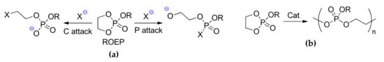 (a) The possible directions of the nucleophilic attack on cyclic ethylene phosphates []; and, (b) ROP of cyclic ethylene phosphates.