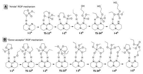Amide (A) and donor-acceptor (B) mechanisms for the TBD-catalyzed ROP of MeOEP [].