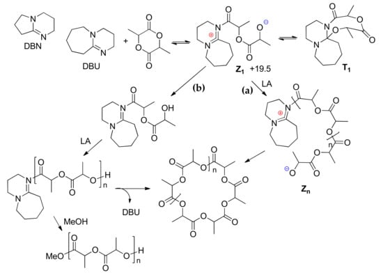 - Brown, H.A.; De Crisci, A.G.; Hedrick, J.L.; Waymouth, R.M. Amidine-Mediated Zwitterionic Polymerization of Lactide. ACS Macro Lett. 2012, 1, 1113–1115. [Google Scholar] [CrossRef]