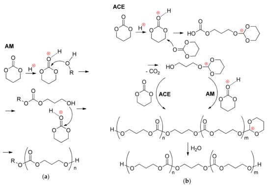 - Shibasaki, Y.; Sanda, F.; Endo, T. Cationic Ring-Opening Polymerization of Seven-Membered Cyclic Carbonate with Water–Hydrogen Chloride through Activated Monomer Process. Macromolecules 2000, 33, 3590–3593. [Google Scholar] [CrossRef]