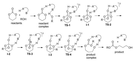 To date, various organocatalysts of ROP have been studied [,,,,,,]. The density functional theory (DFT) methods have been applied for the modeling of the organocatalytic ROP to improve the understanding of the reaction mechanisms for different cyclic substrates, to determine the scope and limitations of ROP in the development of biodegradable polymers with given compositions and architectures. Houk et al. reviewed DFT modeling of the full diversity of organocatalytic processes in 2011 [], the recent review of Jones [] that addressed the contributions of quantum chemistry to the development of ROP also looked at some of the aspects of organocatalytic polymerization of cyclic esters. Ruipérez discussed some aspects of catalytic ROP in a recent review []. Traditionally, organocatalytic ROP mechanisms are divided into base-catalyzed and acid-catalyzed [,,,], but it became clear in recent years that such a split is rather conditional.