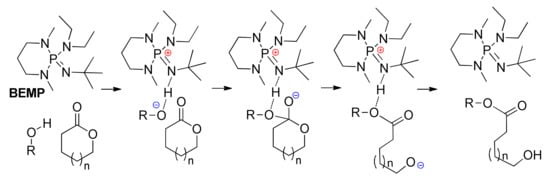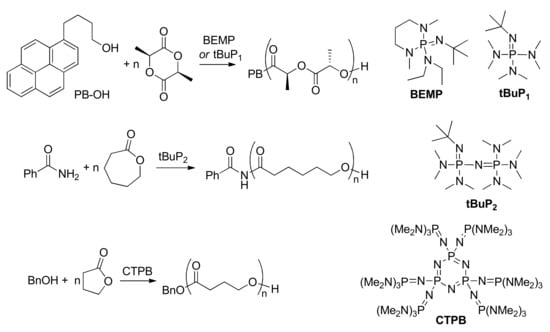 - Liu, S.; Ren, C.; Zhao, N.; Shen, Y.; Li, Z. Phosphazene Bases as Organocatalysts for Ring-Opening Polymerization of Cyclic Esters. Macromol. Rapid. Commun. 2018, 39, 1800485. [Google Scholar] [CrossRef] [PubMed]