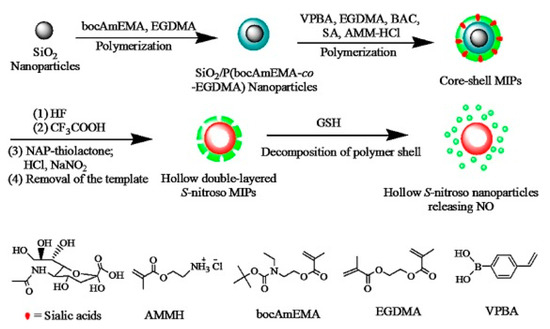 | Sialic acid/S-nitrosothiols | Non-covalent imprinting VPBA, AMMH/BAC, EDMA/BPO/ACN | MIP-coated SiO2/P(EDMA-co-bocAmEMA) NPs/Targeted delivery of S-nitrosothiols (thiol mediated cell uptake, specific target—sialic acid over-expressed on cancer cell membrane) | Stimuli responsive release (GSH or Cu(I) triggered release of nitrous oxide, NO) Drug load—2.1 μmol·g−1 Drug release—1.8 μmol·mg−1, t1/2 = 220 min, (200 µM Cu(I), pH 7.4, 37 °C); 1.7 μmol·mg−1, t1/2 = 145 min, (5 mM GSH, pH 7.4, 37 °C); 0.3 μmol·mg−1, t1/2 = 445 min, (3 mM GSH, pH 7.4, 37 °C) | Yes/No (acrylic Ms) | Material characterization In vitro release, cytotoxicity studies | [76] |