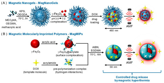 - Griffete, N.; Fresnais, J.; Espinosa, A.; Wilhelm, C.; Bee, A.; Menager, C. Design of magnetic molecularly imprinted polymer nanoparticles for controlled release of doxorubicin under an alternative magnetic field in athermal conditions. Nanoscale 2015, 7, 18891–18896. [Google Scholar] [CrossRef] [PubMed]