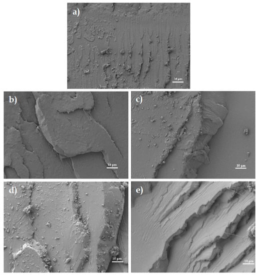 Field emission scanning electron microscopy (FESEM) images of the fracture surfaces of the of the polylactide (PLA) pieces with different weight contents of oligomer of lactic acid (OLA): (a) 0 wt%; (b) 5 wt%; (c) 10 wt%; (d) 15 wt%; and (e) 20 wt%. Images were taken at 1000× and scale markers are of 10 µm.