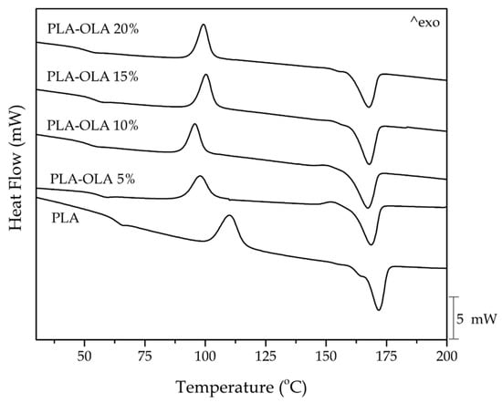 Figure 2 shows a comparative graph with the characteristic DSC thermograms during first heating corresponding to the neat PLA piece and the PLA pieces with different OLA loadings. Table 4 summarizes the main thermal values obtained from the thermograms. One can observe that Tg of neat PLA was located close to 63 °C. Then, the PLA sample cold crystallized indicating that the biopolyester chains could not crystallize in the injection mold. The process of cold crystallization was characterized by a peak at 109.8 °C. Finally, the melting process was defined by a peak temperature of 170.9 °C in which the whole crystalline fraction melted. The effect of the OLA addition on the thermal properties was remarkable. Concerning Tg, a clear decreasing tendency can be observed. In particular, Tg was reduced after the OLA addition down to 50.8 °C, thus indicating plasticization. Ambrosio-Martín et al. [] reported a decrease in Tg with addition of OLA to PLA films from 60 °C to 27.7 °C, concluding that this fact is directly related to the mechanical properties of OLA and it depends on the synthesis procedure []. In the present work, the Tg value of PLA decreased after the addition of OLA but this reduction was much lower than other reported to other plasticizers. For instance, Ljungberg et al. [] reported a Tg decrease of 30 °C with 15 wt% addition of different plasticizers such as triacetin, tributyl citrate (TBC), triethyl citrate (TEC), acetyl tributyl citrate (ATBC), and acetyl triethyl citrate (ATEC).