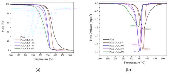 Regarding thermogravimetric characterization, Figure 3 shows the mass versus temperature (Figure 3a) and the first derivative (DTG) versus temperature (Figure 3b) curves for all the PLA pieces. The main results of the thermal decomposition of PLA-OLA blends are summarized in Table 5. One can observe that the neat PLA was much more thermally stable than the toughened PLA formulations with the different OLA loadings. As the OLA content increased, the characteristic TGA curves in Figure 3a shifted to lower temperatures, thus indicating a decrease in thermal stability. DTG curves were very useful to determine the maximum degradation rate temperature (Tdeg), which was seen as peaks in Figure 3b. It can be seen in the graph that there was a clear decreasing tendency of Tdeg with increasing OLA content. Furthermore, the residual mass for all PLA formulations with OLA was almost the same, being below 1 wt%.