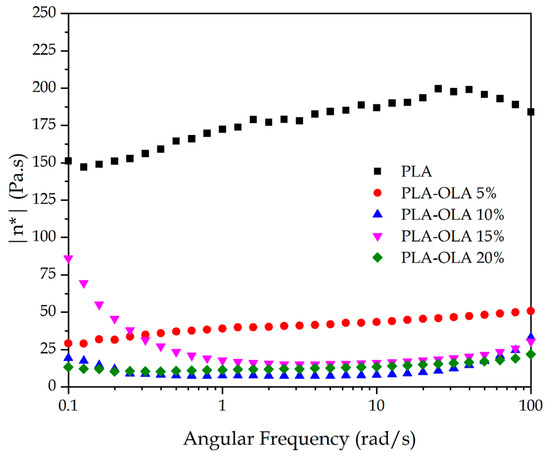 A comparative plot of the complex viscosity (|η*|) of the polylactide (PLA) sheets with different weight contents of oligomer of lactic acid (OLA) at a constant temperature of 200 °C as a function of increasing angular frequency.