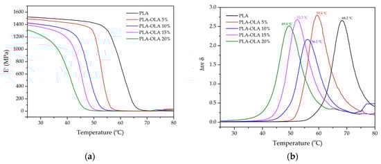 Evolution as a function of temperature of the (a) storage modulus (E’) and (b) dynamic damping factor (tan δ) of the polylactide (PLA) pieces with different weight contents of oligomer of lactic acid (OLA).