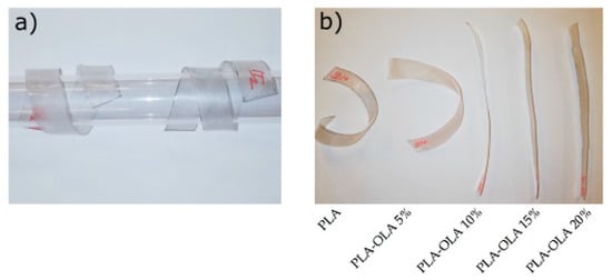 Initially, the shape memory behavior was studied qualitatively by introducing the sheet specimens into a glass tube at room temperature, as observed in Figure 6a, and remained inside for 5 min to retain the shape. Then, the crimped PLA sheets were immersed in a water bath at 70 °C, above the biopolyester’s Tg, and allowed to recover their shape. As can it be seen in Figure 5b, flat sheet shapes were obtained for the PLA materials containing >10 wt% OLA loadings in a short period of 4–10 s, therefore giving support to the significant effect of OLA on the shape memory behavior of PLA. Similar results, under the same conditions, were reported in the development of poly(l-lactide-co-ε-caprolactone) (PLACL), which showed recovery times of approximately 20 s []. Another study was focused on PLA/thermoplastic polyurethane (TPU) blends in which the recovery times at 70 °C were very similar to those obtained in this work, that is, 7–12 s [].