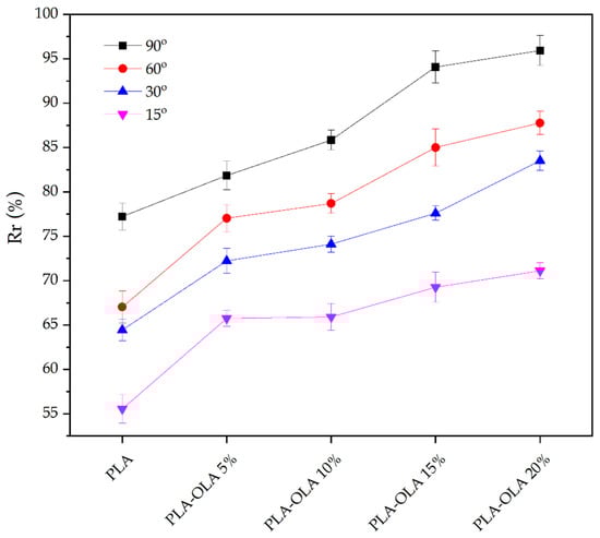 In addition to the qualitative characterization shown above, a quantitative study was carried out to evaluate the influence of the OLA impact modifier on the shape memory behavior of PLA. Figure 7 shows the evolution of Rr for different angles as the OLA content was increased. As it can be seen in the plot, the neat PLA sheet showed limited shape recovery properties and, obviously, it highly depended on the deformation angle. This shape memory recovery was close to 77% for a deformation angle of 90° and it was remarkably lower with more aggressive deformations. For instance, PLA could only recover 55.5% when the initial deformation angle was 15°. As the OLA loading increased, the ability of PLA to recover its initial flat shape (angle of 180°) increased considerably. It is worthy to note the effect of the addition of 20 wt% OLA, which yielded an almost constant increase in Rr of approximately 20% for all the tested angles. Therefore, for this OLA loading, the shape recovery ability of PLA remarkably improved thus leading to an exciting shape memory behavior. As reported by Leonés et al. [], a good shape memory behavior can be attained in electrospun PLA-based fibers containing different OLA loadings in the 10–30 wt% range.