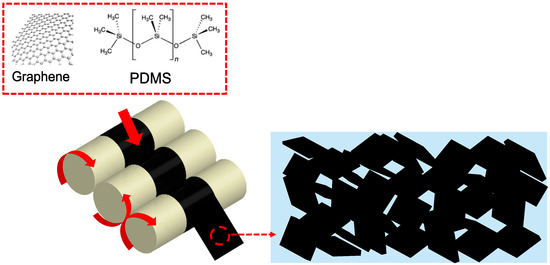 Schematic showing the fabrication of a graphene polydimethylsiloxane (G-PDMS) composite using the three-roll milling method. The 2D carbon nano fillers are dispersed by the mechanical shear forces of the rolls.