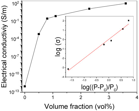 This equation suggests that the conductivity increases when the filler volume fraction increases. Furthermore, the results of the equation are known as the electrical percolation threshold tendency, where σ is the composite conductivity, Pc is the volume fraction (P) of the electrical percolation threshold, and β is a critical exponent. From the best fit of log-log plots of the power low (inset Figure 3), Pc (0.48 vol%) and β (3.9) are obtained. The Pc and β values are quite similar to those of a previously reported graphene composite (Pc and β are 0.5 vol% and 1.31) [46].