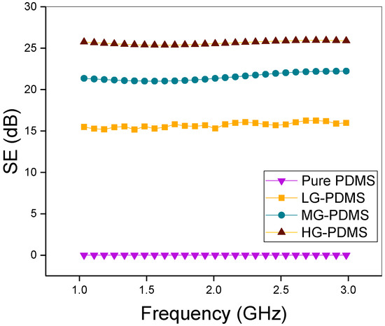 In Figure 4, the EMI SE data of G-PDMS with respect to filler content are shown. The EMI SE was calculated as follows [20,23,30]: