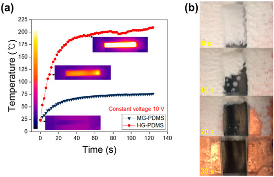 Electrical heating performance of G-PDMS according to filler contents at constant voltage (10 V). (a) MG-PDMS film can induce rapid heating performance from room temperature by electrical power. (b) De-icing properties of the HG-PDMS heating unit are superior because of its rapid heating properties.