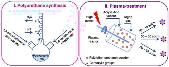 In more detail, in this work powder plasma treatment was performed on particulates based on a custom-made water soluble poly(ether urethane) (PEU) (Figure 1) with the aim to expose carboxylic groups. Specifically, an amphiphilic poly(ether urethane) was first synthesized starting from a commercial triblock copolymer (i.e., Poloxamer® 407) as macrodiol, an aliphatic diisocyanate (1,6-hexamethylene diisocyanate), and a cyclic functional group-free chain extender (1,4-cyclohexanedimethanol). Then, PEU powders were plasma treated according to a two-step procedure, i.e., surface activation in the presence of Argon gas and continuous power supply followed by –COOH group exposure in the presence of Acrylic Acid vapor and alternated power supply.