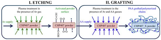Schematic representation of the plasma treatment process: (I) etching phase in the presence of Ar gas to create free radicals on powder surface and (II) grafting step in the presence of Ar gas and Acrylic Acid vapor to expose carboxylic groups.