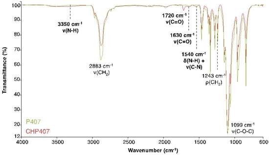Attenuated total reflectance Fourier transform infrared (ATR-FTIR) spectra of Poloxamer® 407 (green) and CHP407 (red). The bands that proved the success of the synthesis (i.e., urethane bond formation) are highlighted in bold.