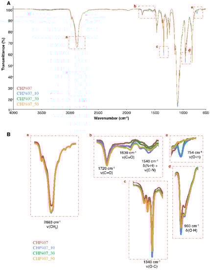 The presence of Poloxamer® 407 in the synthesized CHP407 was confirmed by the peaks at 2883, 1243, and 1099 cm−1, which can be assigned to the CH2 stretching and rocking vibrations and C–O–C stretching vibration, respectively [].