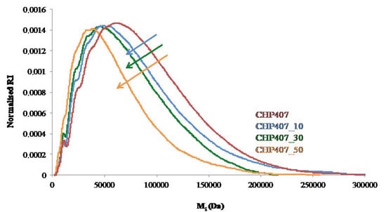 Molecular weight distribution profiles (normalized refractive index (RI) vs. molecular weight of each polymeric component composing the sample (Mi)) of untreated (CHP407) and plasma treated poly(ether urethane) powder (CHP407_X, X = 10, 30, or 50 sccm). Each profile resulted from the average of three different analyses.
