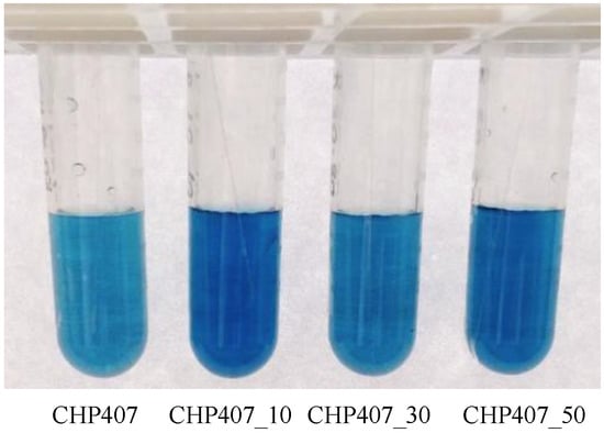 As a consequence of the electrostatic interactions existing between TBO molecules and exposed carboxylic groups, CHP407_X samples exhibited a dark blue color after the desorbing reaction (Figure 6). However, also control samples (CHP407) treated with TBO assay showed a light blue color as a consequence of partial TBO adsorption by polymer chains. Nevertheless, the greater color intensity of CHP407_X samples with respect to CHP407 ones qualitatively confirmed the successful exposure of acidic groups in all tested conditions. In addition, the different color intensity obtained for CHP407_10, CHP407_30, and CHP407_50 suggested the introduction of a different number of carboxylic groups based on the set Ar gas flow rate.