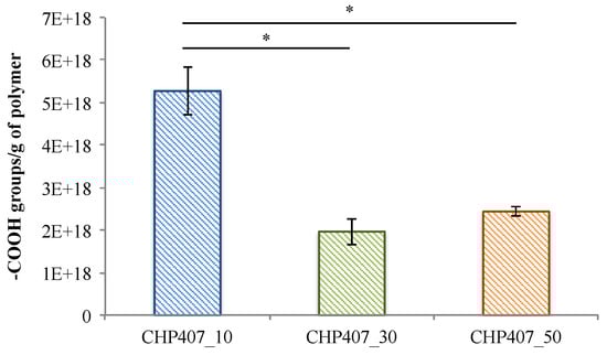 Quantification of exposed carboxylic groups on CHP407_X samples through Toluidine Blue O colorimetric assay. Analyses were performed in triplicate on samples belonging to three different batches. * p < 0.05.