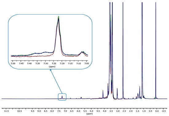 Proton nuclear magnetic resonance (1H-NMR) spectra of two benzylamine (BA)-grafted CHP407_10 batches (CHP407_10_BA_A and CHP407_10_BA_B, green and blue spectra, respectively) and a control sample (CHP407_BA, red spectrum). Magnified insert highlights differences between the spectra.