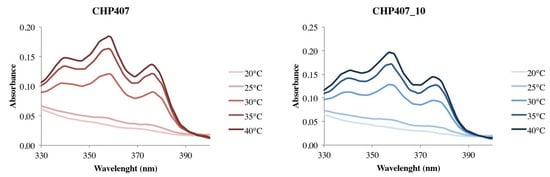 UV/Vis spectra of CHP407 (left) and CHP407_10 (right) solutions (0.1% w/V) added with 1,6-diphenyl-1,3,5-hexatriene (DPH) fluorescent dye recorded in the 330–400 nm spectral range upon heating up to 40 °C.