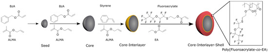 Stepwise synthesis of core-interlayer-shell particles. The seed and core particles consist of poly (benzyl acrylate-co-allyl methacrylate) (BzA and ALMA), the interlayer contains styrene and allyl methacrylate (ALMA) and the shell material is formed by 2-((1, 1, 2-trifluoro-2-(perfluoropropoxy) ethyl) thio) ethylacrylate (fluoro-acrylate) and ethyl acrylate (EA).