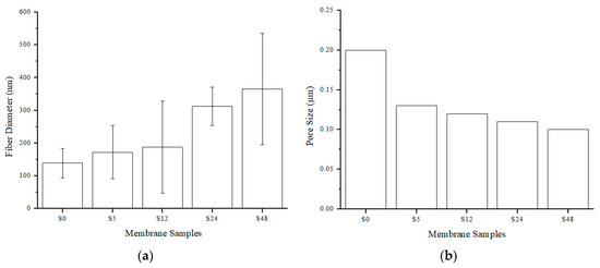 Table 1 shows the membrane properties of nylon 6,6 NFMs. Solvent vapor treatment clearly affects the porosity, the pore size and the surface roughness (Table 1). Figure 2a,b represent the fiber diameter and pore size as a function of solvent vapor exposure time. The fusion and melting of fibers caused an incremental increase in fiber diameter, as can observed in Figure 2a, and reduction in membrane pore size (Figure 2b). This resulted in a porosity reduction whereby the porosity of nylon 6,6 NFM is reduced from 71.30 ± 2.00% to 62.00 ± 1.00% when it is exposed for 48 h. The pore size decreases from 0.2 µm for S0 to 0.1 µm for S48 NFM.