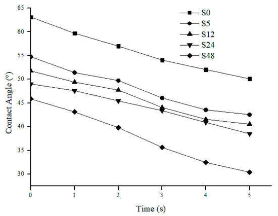 Dynamic contact angle vs. time for untreated nylon 6,6 NFM and treated nylon 6,6 NFM with treatment time at 5, 12, 24 and 48 h.