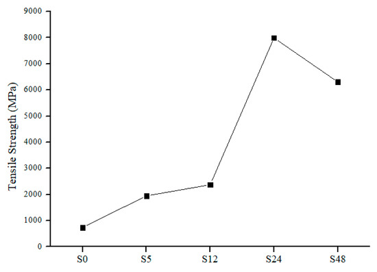 The tensile strength of nylon 6,6 NFM after solvent vapor treatment is illustrated in Figure 5. The tensile strength for S0 is 737 MPa, respectively. After treatment of solvent vapor, the tensile strength increases gradually with an increase in exposure time. The tensile strength increases by 62%, 69%, and 91% for S5, S12 and S24, respectively. The increment in tensile strength is due to fusion at the junction of nanofibers [39,40]. The solvent vapor treatment promotes fusion between the interfiber junctions due to condensation of formic acid vapor. The longer the treatment time, the greater the number of junctions that can be induced by the vapor (the higher the number of crosslinking between fibers). The increase in tensile strength was also correlated with FESEM images (Figure 1). It also enlarges the fibers by merging them into different sites. Apart from that, solvent vapour treatment promotes random fusion across the NFM. By having random fusion, it will give a larger distribution of tensile strength, hence increasing NFM tensile strength.