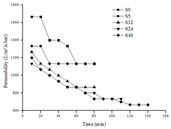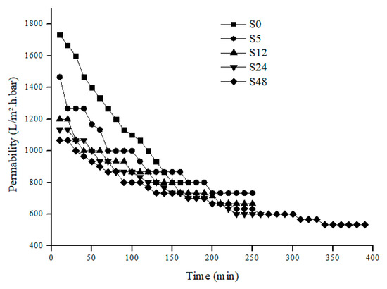 Nevertheless, interestingly, all treated NFM took a longer time to reach steady-state compared to an untreated one showing lower membrane fouling propensity. This can be clearly observed in Figure 7 where S48 took the longest time (340 min) to achieve steady-state or, in other words, took the longest time to get fouled. This indicates that solvent vapor treatment can help to delay the accumulation of foulants on the membrane surface since it increases hydrophilicity and also reduces membrane surface roughness. Despite the reduction of permeability when solvent vapor treatment is applied, by reducing fouling, it will prolong the membrane life and also reduce the membrane operational costs [41].