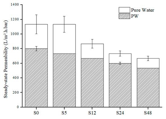For permeability analysis, it is based on overall and steady-state permeability of pure water and PW feed. Based on Figure 6 and Figure 7, both pure water and PW show the same trend of permeability where the permeability decreases as the treatment time increases. Like the overall permeability, both steady-state permeability of pure water and PW share the same trend (Figure 8). For steady-state permeability of PW, the highest was achieved by untreated nylon 6,6 NFM (800 L/m2.h.bar). Meanwhile, S48 has the lowest steady-state permeability of PW (533 L/m2.h.bar). This correlates with the FESEM images (Figure 1) and also the membrane properties (Table 1) where the membrane pore size becomes smaller as the treatment time increases due to the melting and fusion of fiber which then reduces the porosity and permeability of the membrane.