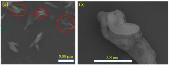 The SEM images of MFC are presented in Figure 1a,b, which were captured at low and high magnification with the same spatial resolution. However, these two images were captured for the same specimens focusing on two different areas to investigate the MFC particles. MFC particles were rod-like shaped, in which their width was in the range of 500–1000 nm and length in several micrometers less than 10 µm. In both images, the individual MFC particles and their agglomeration are shown by the circle and hexagon, respectively. The dimensions of MFC as observed from SEM in Figure 1 were similar to those previously reported [,,,].