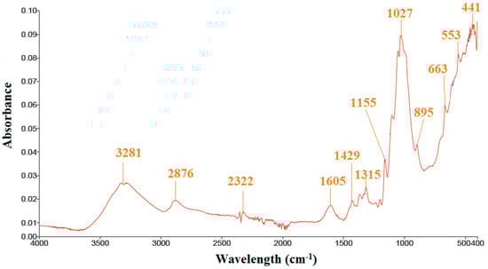 Significant numbers of FT-IR peaks for band position and possible stretching were observed for MFC as given in Figure 2 and Table 1. The appearance of a peak at 3281 cm−1 was associated with the –OH bending vibration, while the peak at 2876 cm−1 was probably due to the C–H stretching of MFC. The bending vibrations of C–O and C–H observed at 800–1400 cm−1 were due to the cellulose structure of the MFC. There was a weak peak at 2322 cm−1, which was possibly due to alkaline stretching, but this is unreliable in the case of MFC. Moreover, the peaks at 1605 cm−1 were due to the removal of lignin in the MFC. Furthermore, the peaks near 450 cm−1 and 800 cm−1 seemed to be due to the silica of MFC apart from raw rice husk. The FT-IR results of MFC in this study were in good agreement with other published works [,,,].