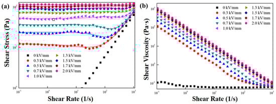 Flow curve of shear stress (a) and shear viscosity (b) of the MFC-based electrorheological (ER) fluid under various electric filed strengths. The line in (a) is fitted by the Cho–Choi–Jhon (CCJ) model.