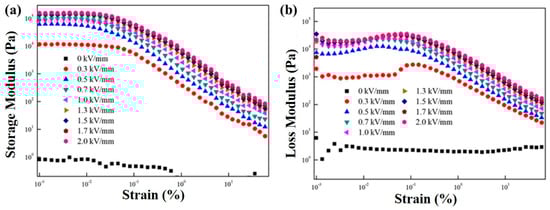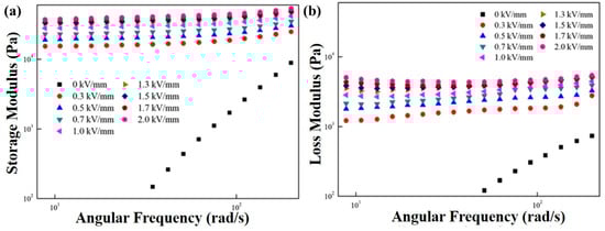 Figure 6 represents the angular frequency sweep test result of the MFC-based ER suspension at a constant strain value (γLVE = 0.005%) over an angular frequency region from 1 to 200 rad/s under different electric field strengths. As presented in Figure 6, the storage and loss moduli showed a fluid-like property that increased with increasing angular frequency without an electric field input. With the input of electrical field strength, the storage modus values were higher than those of the loss modulus, demonstrating that the solid-like characteristic with a stable plateau region prevailed over the viscous behavior. In addition, constant storage modulus values indicated that the fibrillar structure of the ER suspension was not broken in this window of angular frequency.