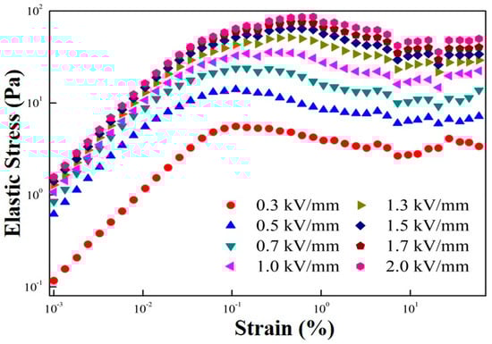 Figure 5 shows the elastic stresses of the ER suspension for different electrical field strengths. This elastic stress based on the strain amplitude sweep study was used to deduce the elastic yield stress, which is different from both static and dynamic yield stresses estimated from a steady shear test. As shown in Figure 5, at a low strain region, the elastic stresses increased almost linearly with the shear strain, implying that the ER suspension responded to the deformation elastically. Around the critical strain value, which is related to the deflection point, their slopes changed. The maximum value of the elastic stress showed a quantitative way of identifying the yield point.