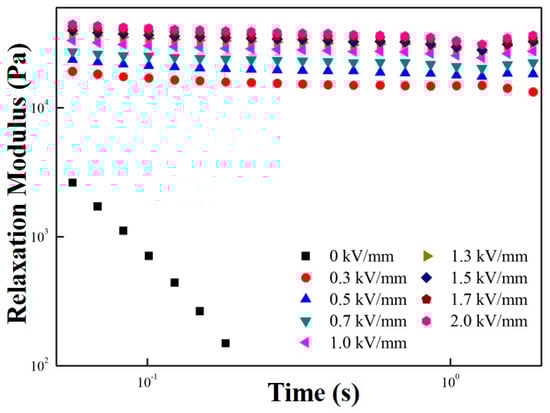 The relaxation modulus (G(t)) in Equation (2) describes the time-dependent relaxation characteristic of the MFC particle-based ER suspension. From Equation (2), a short-time relaxation behavior of the material can be predicted. At the zero-electrical field strength, the relaxation modulus of MFC particle-based ER fluid decreased sharply and showed a fluid-like behavior. However, when the electrical field strengths were applied, the plateau window appeared, showing its solid-like property.