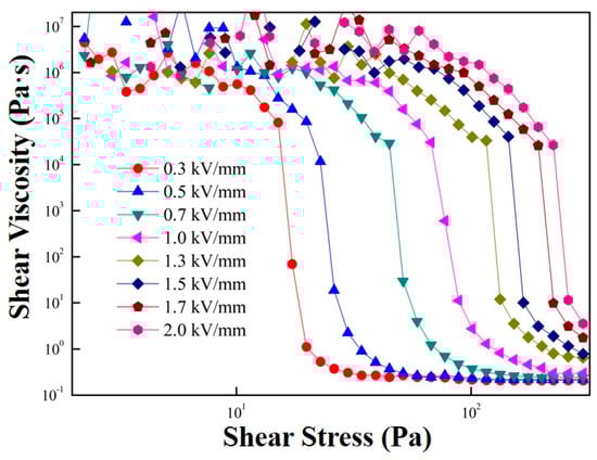 Shear viscosity versus shear stress measured in the controlled shear stress (CSS) mode for MFC particle-based ER fluid under various electric field strengths.