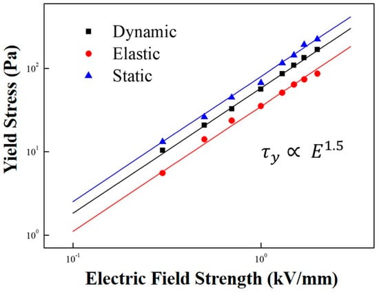 Similar values of the dynamic, elastic, and static yield stresses are presented in Figure 9; all show the same slope of approximately 1.5 following the conduction mechanism. The slope of the ER fluid less than 2.0 was reported to be related to the indication of insufficient dipole moments from irregular sizes and shapes in the case of the MCC [,]. For various ER materials, the elastic yield stress measured from a dynamic test is generally reported to be slightly lower than that determined from the steady-state test. In addition, the static yield stress was slightly higher than the dynamic yield stress obtained from the controlled shear rate test.