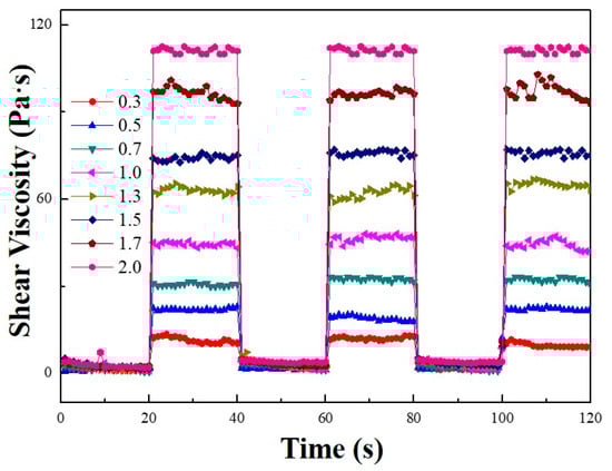 Figure 10 illustrates the electrical field “on–off” test on the shear viscosity behavior, which was measured at a fixed shear rate (=1 s−1) and square voltage pulse (20 s), at various voltages (0.3–2.0 kV/mm). The results indicated the sensitivity and reliability of the MFC-based ER suspension. For each electric field applied, the shear stress grew quickly to a certain high level when the electrical field was applied and dropped to zero when the electrical field was turned off. At each turning point, the shear stress change of the ER fluid was rapid without any hysteresis, implying a reversible and fast change of the chain-like structure in the ER fluid under an electrical field.